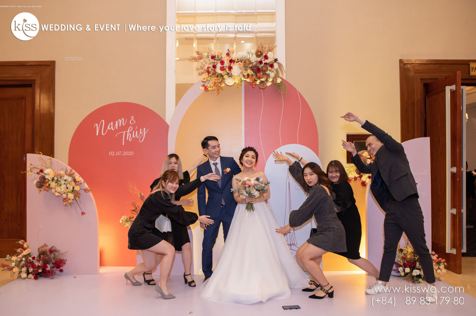 Nhưng cũng sẽ có một số bên trang trí tiệc cưới tư vấn cho cặp đôi nên để vị trí của bàn gallery trước rồi mới đến backdrop chụp hình. Cách sắp xếp như vậy không phải là không được nhưng lưu ý là với số lượng khách mời đông khu vực gallery check in sẽ hơi bị dồn ứ nhẹ. Thường thì hiếm khi tụi mình chọn bố trí cho các tiệc cưới của mình cách này.