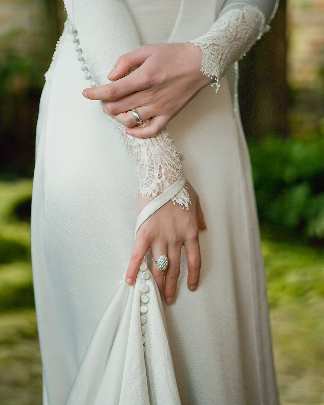 Một chiếc đám cưới được tổ chức trong rừng được trang trí ngập tràn hoa theo tone màu trắng. Là một tiệc cưới thân mật với sự chứng kiến của những người thân phù hợp với những cặp đôi yêu thích không gian ngoài trời và nhiều cây xanh. Bên cạnh đó, phần váy cưới của Bella, được thiết kế bởi Carolina Herrera, với phần lưng ren cổ điển, đã trở thành xu hướng thời trang cưới suốt nhiều năm sau khi phim ra mắt.
