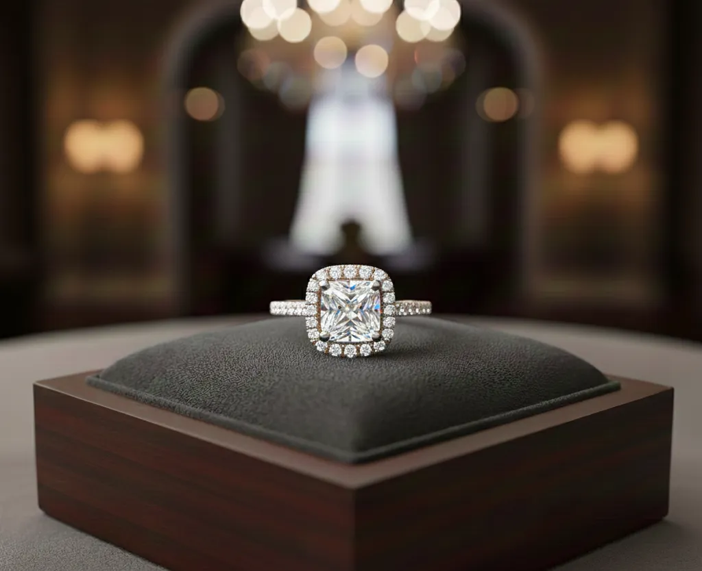 Nếu bạn muốn sự mạnh mẽ, cá tính và hiện đại, hãy chọn mẫu nhẫn halo có khung hình vuông hoặc hình chữ nhật bo góc (Cushion). Những góc cạnh của thiết kế này tạo cảm giác diện tích bề mặt lớn hơn hẳn so với dáng tròn, mang lại phong cách quý tộc, quyền lực.